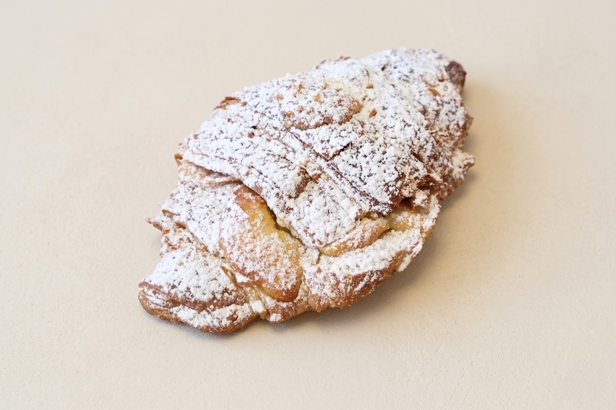 Pâte à croissant, crème d’amande et amande hachée dessus — Blé (gluten), œufs, fruits à coque (amande).