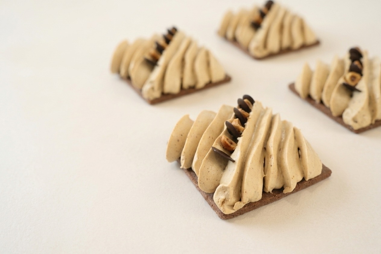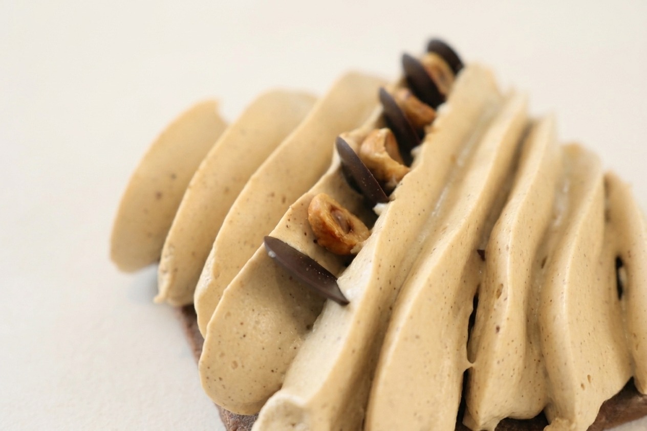Pâte sucrée choco, praliné, ganache, crème à la margarine allégée praliné.