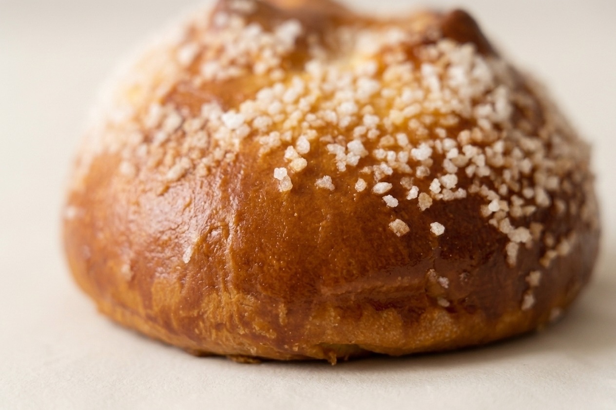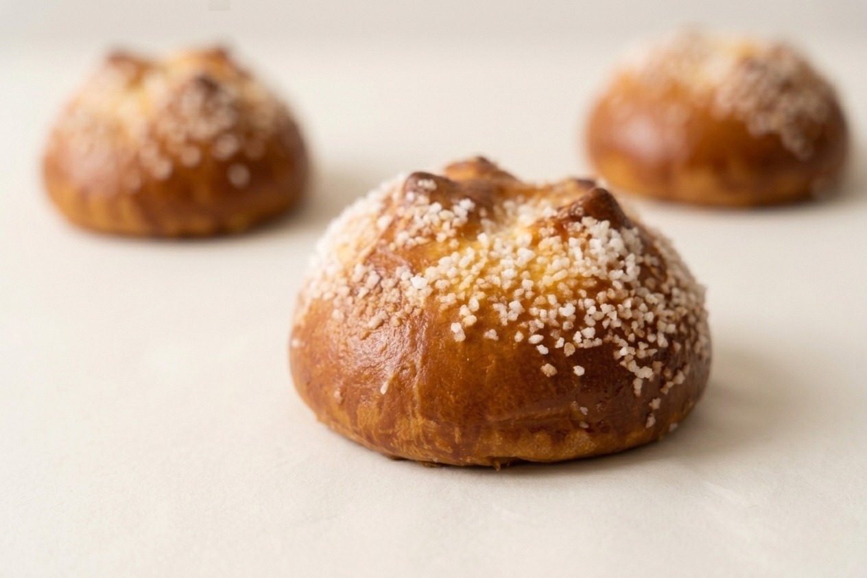 Pâte à brioche en forme de grosse boule, sucre dessus. — Blé (gluten), œufs.