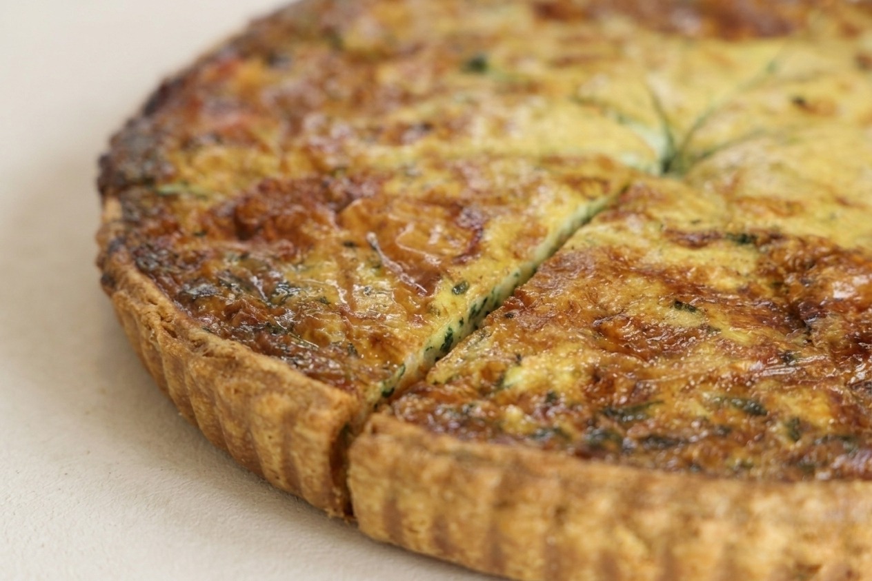 Pâte feuilletée, appareil à quiche, saumon, épinard. Blé (gluten), œufs, poisson.