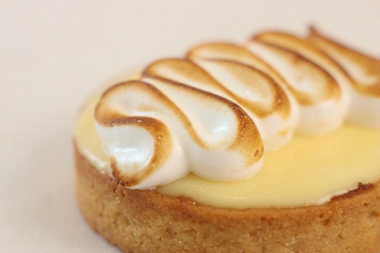 Pâte sucrée, croustillant praliné riz soufflé, crème citron, meringue. — Blé (gluten), œufs, fruits à coque.